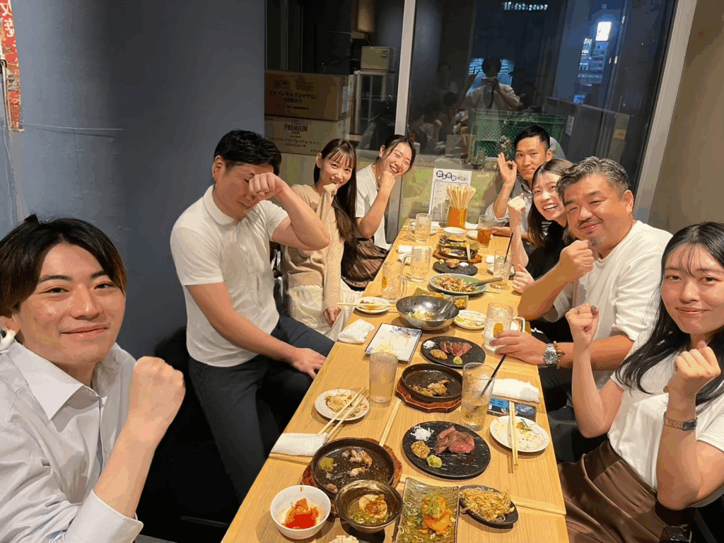 サウナ後のお楽しみである、食事会へ整ったメンバーたちと向かいます。場所はサウナ部の部長が毎回選んでくださり、いろんな方とお話が出来るよう席次も決めてくれています。サウナで整った身体に、おいしい料理とお酒が染みわたります。先輩方に他の部署の仕事について聞くことが出来たり、仕事以外の話でも盛り上がることができるので、とても楽しいひとときです。こちらも1~2時間ほど楽しんだら、部長の〆のお言葉をいただいて解散となります。今回は15名ほど集まり、新しく参加された方、皆勤賞の方とサウナが初めての方から上級者まで、いろいろな人が楽しめる素敵な活動だと思いました。